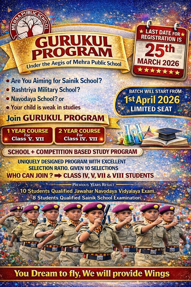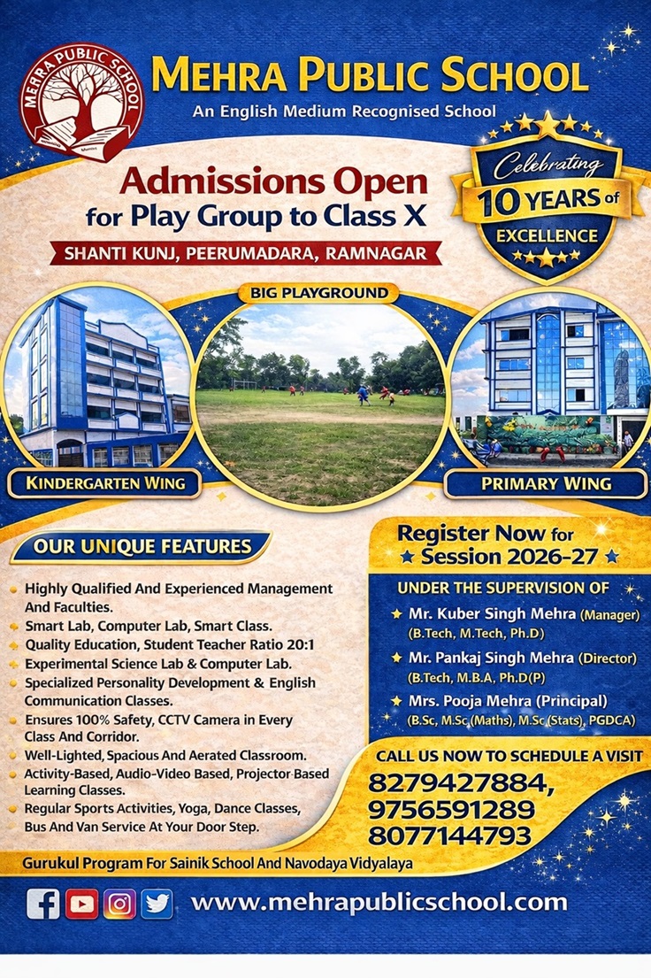 The Mehra Education & Welfare Society (MEWS), registered under the Societies Act XXI of 1860 at Haldwani (Uttarakhand) is sponsored by the Mehra Family located in Peerumadara. The prime objective of the Society is to provide facilities for quality education to boys and girls of all ages by establishing educational institutes like Mehra Public School (MPS), Mehra Coaching Academy and Gurukul Defence Academy. Mehra Public School was the second initiative of the society, started in year 2015 with a view to offer kindergarten, primary and senior secondary education.